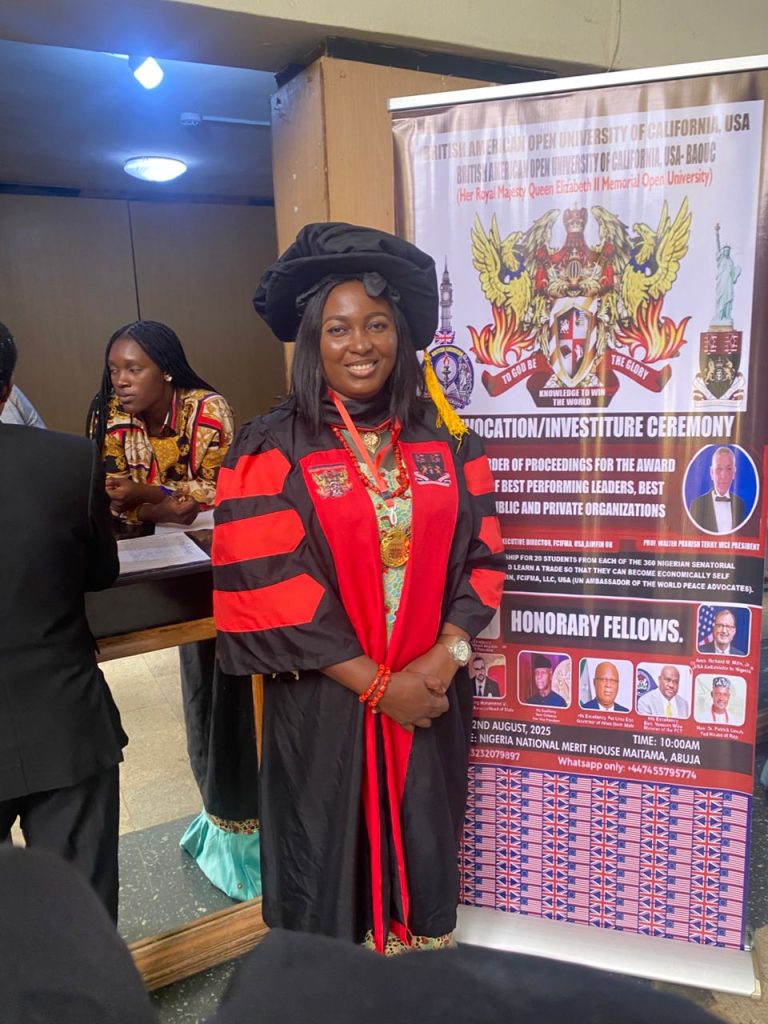 We are thrilled to celebrate a remarkable achievement by Dr. Rebecca Bolanle Ukpevo, Vice Chairperson of the Nigeria Association of Women Journalists (NAWOJ) FCT Chapter, Dr. Ukpevo who has been honored with an Honorary Doctor of Philosophy (Ph.D.) in Leadership and Management from the British American Open University of California, USA, and a prestigious Award of Honorary Fellow from the British American Institute of Governance, Leadership, and Business (BAIGRAB UK), Sheffield, England.