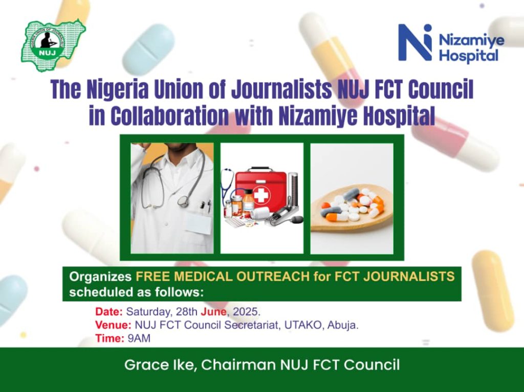 The Nigeria Union of Journalists (NUJ), FCT Council, in collaboration with Nizamiye Hospital, invites all members to a Free Medical Outreach scheduled as follows: